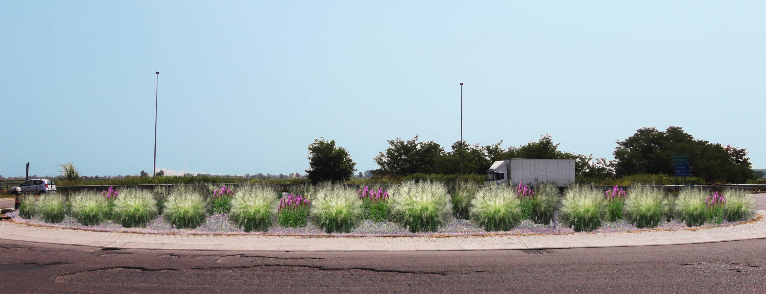 Il progetto ha previsto la sistemazione a verde della rotatoria senza impianto di irrigazione e prevedendo, nella prima proposta, la realizzazione di quinte parallele tra loro con l'alternanza di graminacee e siepi da mantenere in forma di parallelepipedo.